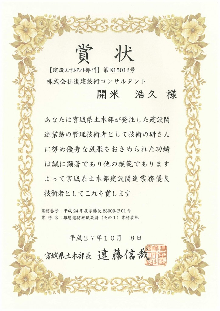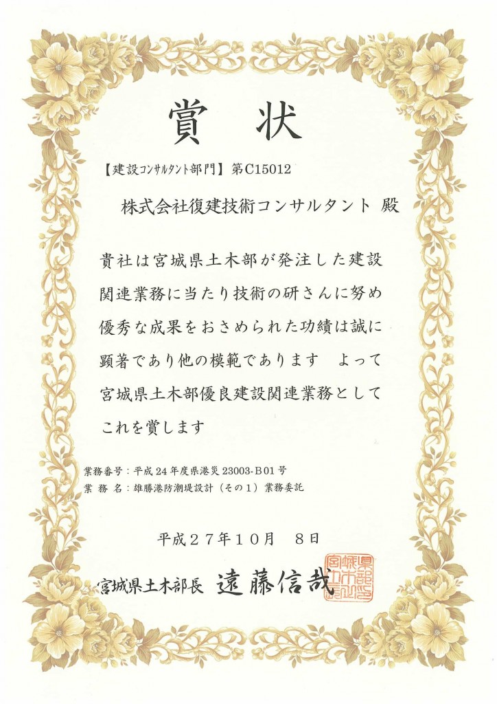 宮城県土木部優良建設関連業務として、弊社の行った下記業務が表彰されましたのでお知らせします。