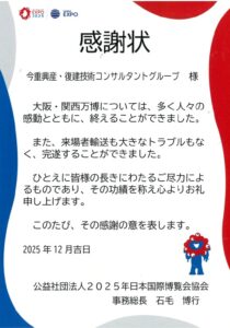 この度、公益社団法人2025年日本国際博覧会協会より感謝状を頂きましたので、お知らせいたします。