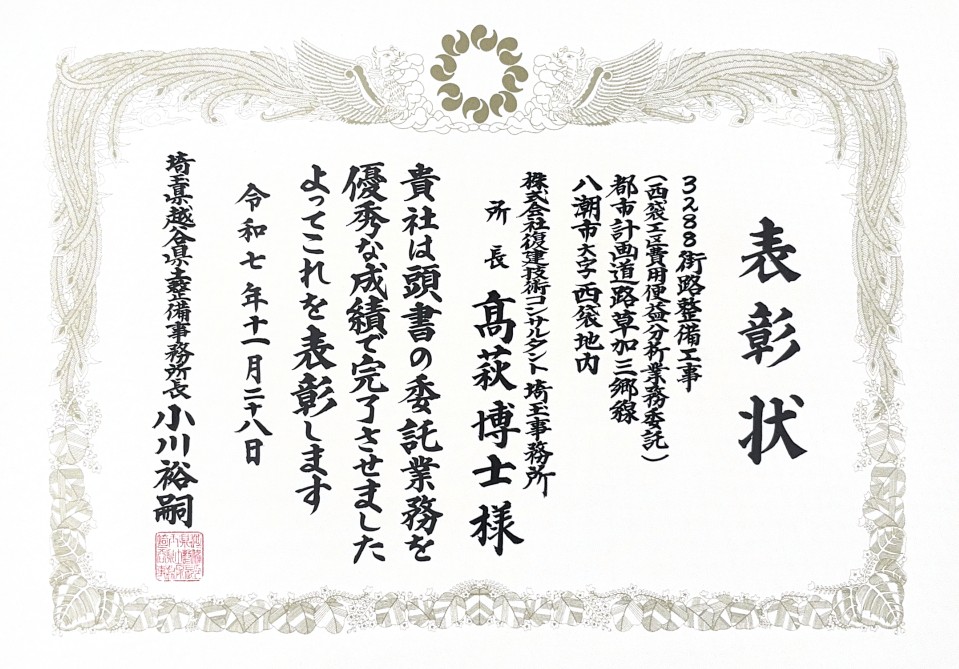 この度、埼玉県越谷県土整備事務所より令和7年度東部地区合同埼玉県県土づくり優秀委託業務表彰を受賞しましたので